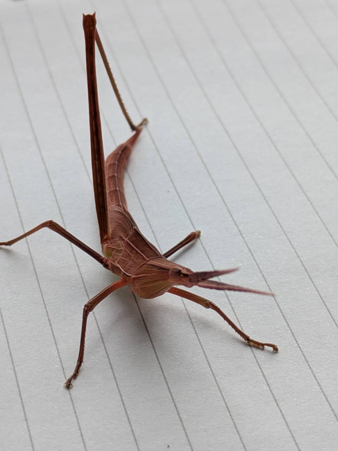 北上店の女鹿です。     ピンク色のキリギリスが我が家にやってきました。 珍しいので、幸運を呼ぶと言われているようですが…