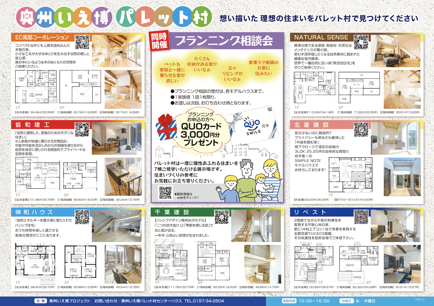 【ご報告】地元企業7社による7棟の合同住宅展示場『奥州いえ博パレット村ーSUN-(第3回)』は令和6年3月31日をもって閉館いたしました。 1年間、多くの方にご来場いただき、スタッフ一同感謝の気持ちでいっぱいです。みなさまのご来場、誠にありがとうございました。