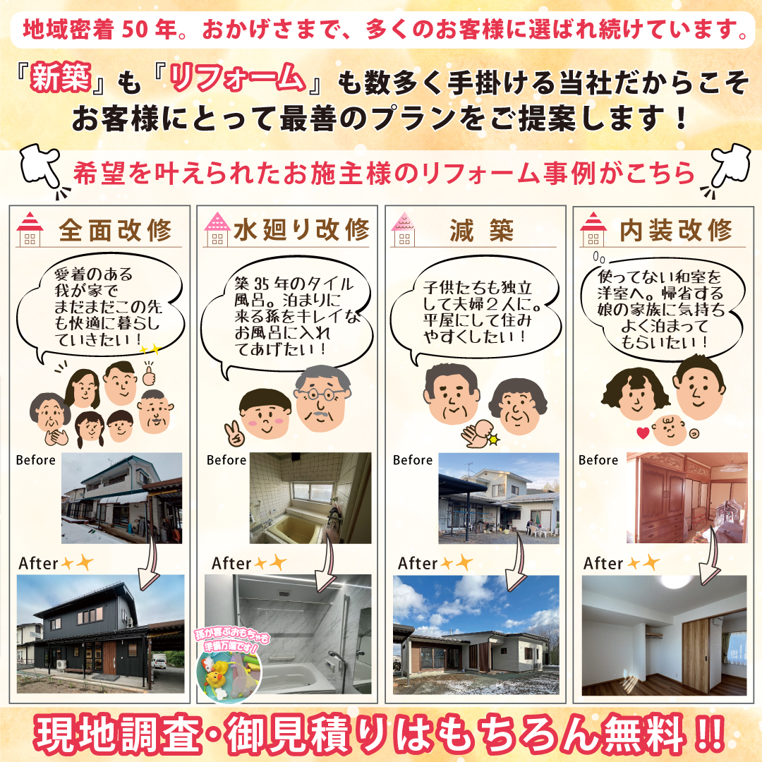 当日会場では、これまでの豊富な施工例をパネルで展示!住まいのお悩み・リフォームの疑問などこの機会にどんなことでもお気軽にご相談ください!『新築』も『リフォーム』も 数多く手掛ける当社だからこそお客様にとって最善のプランをご提案します!現地調査・御見積りはもちろん無料!!