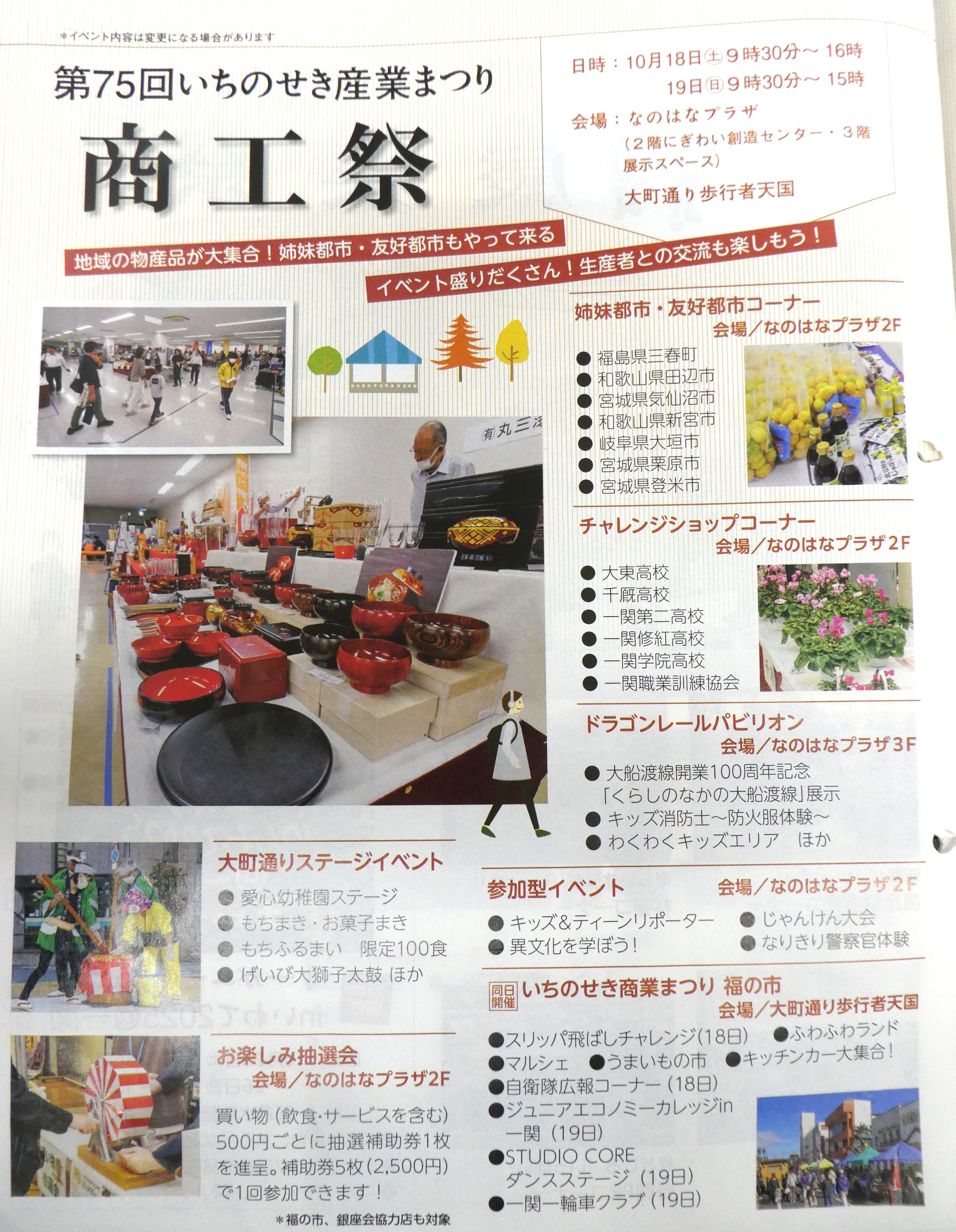 今週末、10/18(土)・19(日)には、なのはなプラザにて、いちのせき産業商工祭があります。