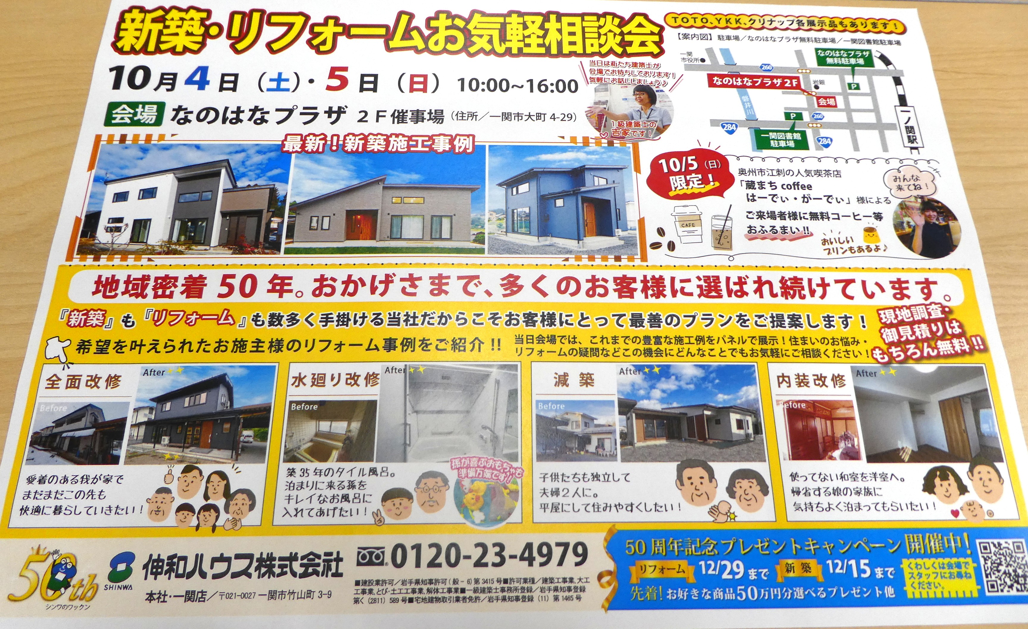 10/4(土)・5(日)に、なのはなプラザ2階にて「新築・リフォーム相談会」を開催し、